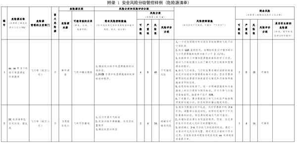 注2:民航風(fēng)險(xiǎn)分級(jí)沿用國(guó)際民用航空組織分級(jí)標(biāo)準(zhǔn),通常為三個(gè)等級(jí),與國(guó)家安全生產(chǎn)領(lǐng)域“紅橙黃藍(lán)”四個(gè)風(fēng)險(xiǎn)等級(jí)對(duì)應(yīng)關(guān)系為:民航的不可接受風(fēng)險(xiǎn)對(duì)應(yīng)國(guó)家安全生產(chǎn)領(lǐng)域的重大風(fēng)險(xiǎn)(紅)和較大風(fēng)險(xiǎn)(橙);民航的緩解后可接受風(fēng)險(xiǎn)對(duì)應(yīng)國(guó)家安全生產(chǎn)領(lǐng)域的一般風(fēng)險(xiǎn)(黃);民航的可接受風(fēng)險(xiǎn)對(duì)應(yīng)國(guó)家安全生產(chǎn)領(lǐng)域的低風(fēng)險(xiǎn)(藍(lán))。
