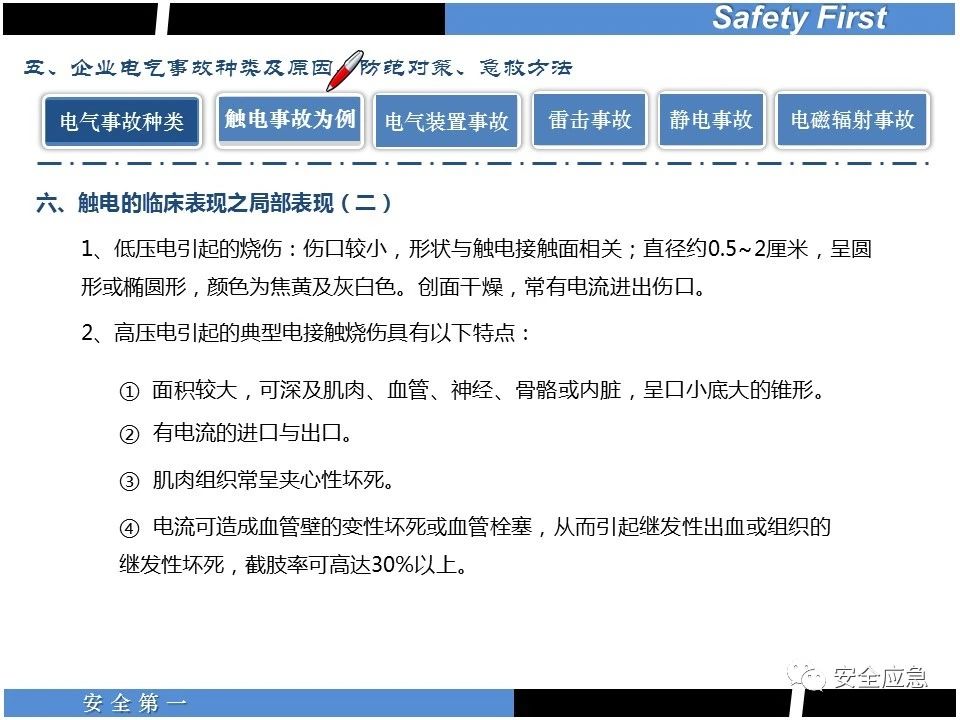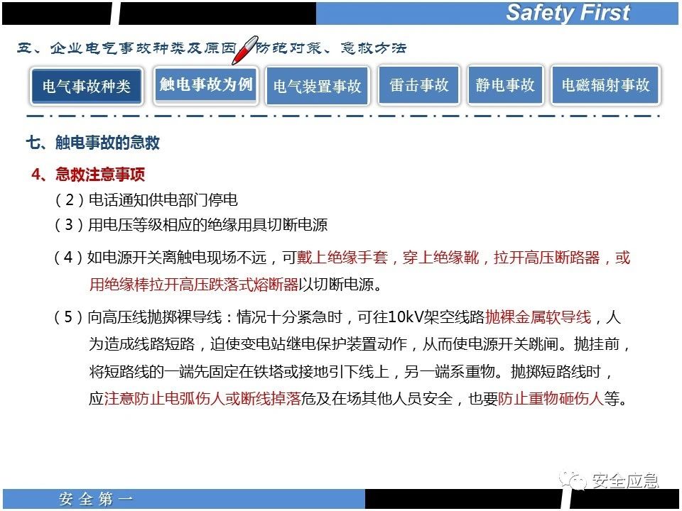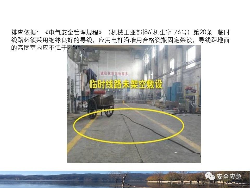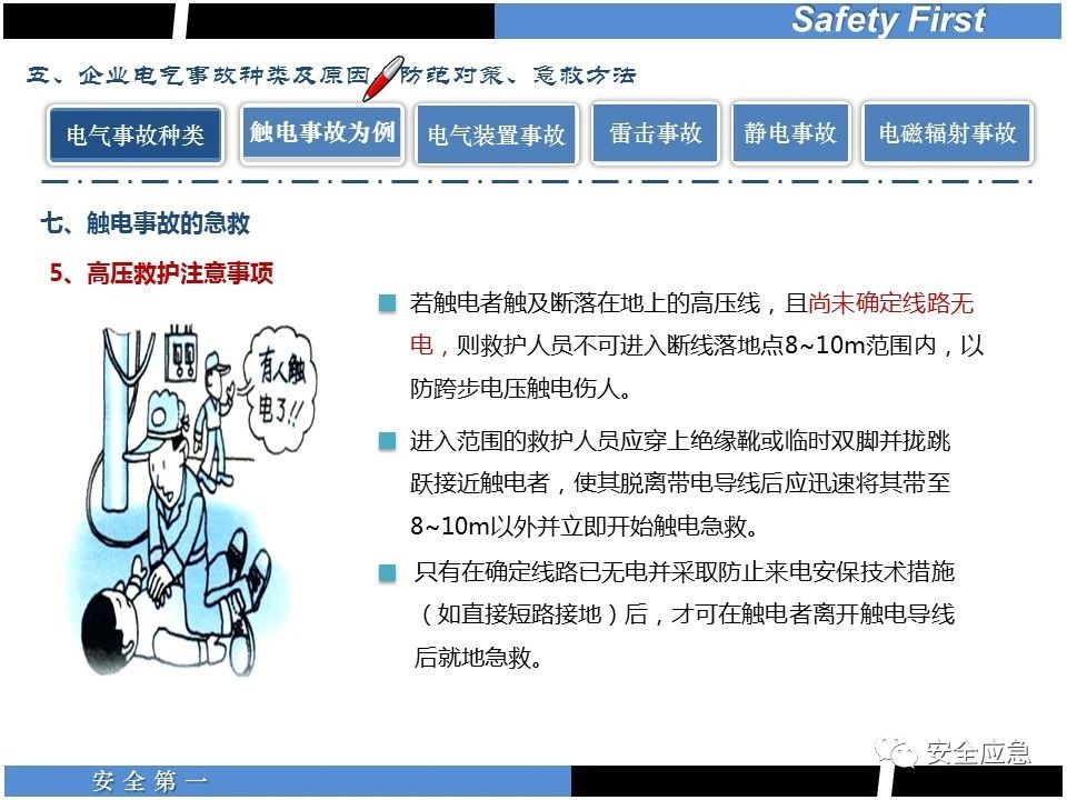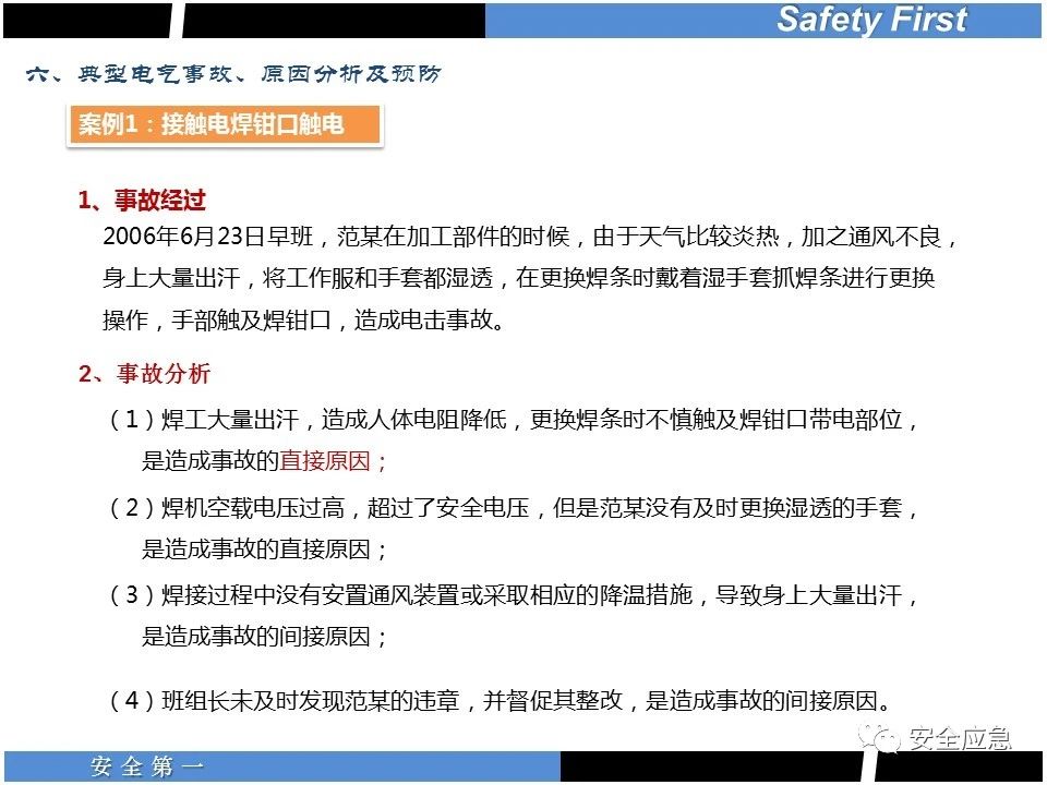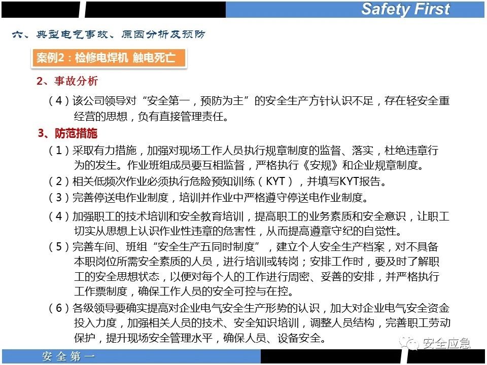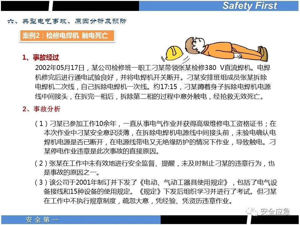 案例73 事故案例73:某35變電站準(zhǔn)備10kV避雷器試驗(yàn)。作業(yè)人員會同運(yùn)行人員準(zhǔn)備查看設(shè)備實(shí)際情況,拆卸10kV開關(guān)柜背板螺栓,打開了柜門上的電磁鎖,并打開了后柜門后,作業(yè)人員探頭進(jìn)入開關(guān)柜內(nèi)時(shí),對開關(guān)柜放電。 其它案例見17、18、19、20、21、22、23、50、52。 (27)多組人員組織混亂 案例74 事故案例74:某單位開展500kV線路停電檢修和地線融冰試驗(yàn)。1名工作人員不聽他人勸阻,登塔拆除引流線。隨后開展地線融冰試驗(yàn),該工作人員觸電死亡。 其它案例見45、46、47、48。 (28)交底不認(rèn)真 案例75 事故案例75:某工作負(fù)責(zé)人帶領(lǐng)兩名工作人員準(zhǔn)備在10kV線路裝設(shè)接地線。工作前,工作負(fù)責(zé)人沒有進(jìn)行班前(后)會,沒有分配工作任務(wù),也沒有交代安全注意事項(xiàng),另外兩人也沒有主動(dòng)詢問,相互提醒,導(dǎo)致工作負(fù)責(zé)人無監(jiān)護(hù)誤登運(yùn)行線路,造成觸電。 其它案例見32。 (29)監(jiān)護(hù)不到位 l 單人工作無監(jiān)護(hù) 事故案例:36。 l 監(jiān)護(hù)人參與工作 事故案例:11。 l 監(jiān)護(hù)不認(rèn)真,或默許違章行為 事故案例:67。 (30)人員、工作安排不恰當(dāng) 案例76 事故案例76:某供電所安排不具備單獨(dú)工作資格和能力的新入廠員工上桿進(jìn)行配變設(shè)備搶修工作,由于安全距離不夠,員工經(jīng)驗(yàn)不足,監(jiān)護(hù)不到位,導(dǎo)致觸電。 案例77 事故案例77:某高壓試驗(yàn)班開展定檢預(yù)試作業(yè)。工作負(fù)責(zé)人與工作人員在抄錄放電計(jì)數(shù)器銘牌,另一名剛參加工作不久的工作人員拿著自制試驗(yàn)線插入移動(dòng)電源盤插座內(nèi),然后,用左、右手分別拿住兩個(gè)鱷魚夾準(zhǔn)備對放電器搭接做試驗(yàn),左、右手習(xí)慣性的分別握住了兩個(gè)鱷魚夾的導(dǎo)體部分,此時(shí)電流通過人體,漏電保護(hù)器沒有動(dòng)作,觸電死亡。 (31)單人作業(yè) l 野外單人巡線、勘察 案例78 事故案例78:某單位開展線路巡視時(shí),單人作業(yè),在被告知“巡視完N58塔后切勿過江,要沿原路返回”的情況下,仍然獨(dú)自一人違規(guī)游泳過江,溺水身亡。 案例79 事故案例79:某單位野外勘察時(shí),某工作人員在未告知工作負(fù)責(zé)人的情況下,獨(dú)自一人返回車輛所在地,途中墜落懸崖暈倒,受輕傷并失蹤12小時(shí)。 附件:最全面的電氣安全培訓(xùn),實(shí)用!