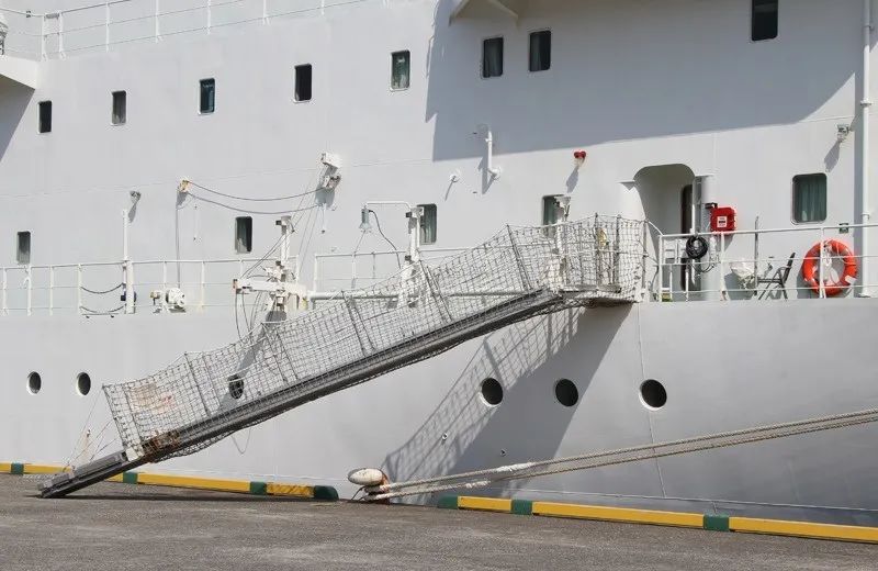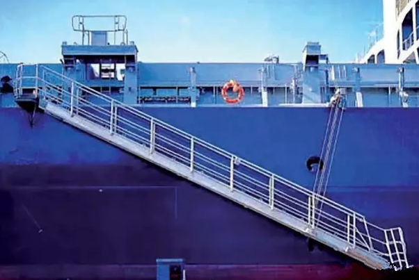 根據(jù)新生效的GB/T11701-2021《船用舷梯的基本規(guī)定》(3月1日起施行),舷梯主要分為兩類: (1)旋轉(zhuǎn)平臺式舷梯 單節(jié)舷梯、多節(jié)舷梯或伸縮舷梯的結(jié)構(gòu)與上面的旋轉(zhuǎn)平臺鉸接,可在船與登梯底面之間改變方向和傾斜角度。舷梯可用鋼絲繩或鏈從較低的(各)懸掛點掛住,或用固定在舷梯底部滾柱支持。 (2)固定平臺式舷梯 單節(jié)舷梯、多節(jié)舷梯或伸縮舷梯的結(jié)構(gòu)與上面的固定平臺鉸接,可在船和登梯底面之間改變傾斜角度。舷梯用鋼絲繩或鏈從較低的(各)懸掛點掛住,單獨(dú)使用的引航員舷梯采用此固定平臺式舷梯。 根據(jù)SOLAS第II-1章第3-9條款,凡是2010年1月1日及以后建造的船舶,必須在船上安裝經(jīng)認(rèn)可的登/離船設(shè)施,以備在港口或港口相關(guān)操作時使用。 該登/離船設(shè)施必須根據(jù)MSC.1/Circ.1331通函的要求進(jìn)行建造、測試、安裝及維護(hù),主要包括以下八點要求: (1)登/離船設(shè)施應(yīng)遠(yuǎn)離工作區(qū)域以及貨物或其它物體懸掛吊裝時可能通過上方的區(qū)域,該登/離船設(shè)施的目的和使用方式與引水員登 / 離船裝置是不同的; (2)應(yīng)提供足夠的照明,以照亮登/離船設(shè)施、甲板上人員登/離船和裝置控制的位置; (3)當(dāng)?shù)?離船裝置在使用時,在其附近應(yīng)備有一只帶有自亮浮燈和救生浮索的救生圈(注意這里是要求一只救生圈既配備有自亮浮燈又配備有救生浮索,并且處于隨時可用狀態(tài)); (4)每部舷梯應(yīng)具有在其最大操作傾斜角時,下平臺在最輕載水線以上不大于600mm的高度; (5)在每部舷梯或跳板梯的兩端應(yīng)設(shè)置一塊標(biāo)記牌,以清楚顯示安全操作和負(fù)荷限制,包括最大和最小允許設(shè)計傾斜角、設(shè)計負(fù)荷、最大底端板負(fù)荷等,如果最大操作負(fù)荷小于設(shè)計負(fù)荷,則最大操作負(fù)荷也應(yīng)顯示在標(biāo)記牌上; (6)跳板梯使用時安放水平傾斜角不應(yīng)大于30度和舷梯使用時水平傾斜角不應(yīng)大于55度; (7)在人員從登/離船設(shè)施或船舶與碼頭之間可能墜落的舷梯下應(yīng)安放安全網(wǎng); (8)正確設(shè)置舷梯下平臺的安全插銷。 收放前:應(yīng)對升降機(jī)械、鋼絲繩、滑車轉(zhuǎn)盤平臺支架等進(jìn)行檢查,確認(rèn)設(shè)備完好,鋼絲、卷筒、吊梁無障礙后方可作業(yè)。 收放過程中: (1)船靠離碼頭收放舷梯過程中,應(yīng)有專人指揮,作業(yè)人員默契配合。在浮動的梯子上進(jìn)行收起、安裝欄桿、護(hù)繩作業(yè)時,應(yīng)先檢查平臺支架是否已可靠支好,并使用止蕩索,上舷梯操作人員必須系好安全帶,穿好救生衣。 (2)舷梯落岸下踏板應(yīng)避開障礙物,安放平穩(wěn),嚴(yán)禁扭曲。吊梁、鏈條要注意絞高或安放妥當(dāng),以免碰頭和妨礙上下船。 (3)由于潮夕、裝卸貨、碼頭環(huán)境等因素影響,舷梯不能放置碼頭時,要注意隨時調(diào)整舷梯高度。當(dāng)舷梯下踏板離碼頭較高較遠(yuǎn)時,不允許勉強(qiáng)上下。梯口值班人員負(fù)責(zé)調(diào)整舷梯和提醒上下人員注意安全,必要時應(yīng)按規(guī)定加裝橋梯。 (4)由于漲落潮、移泊等原因需要松緊纜繩時,應(yīng)絞起舷梯,收起橋梯,或?qū)H丝春锰菘诮谷藛T上下。在無法使用舷梯時,要正確地搭設(shè)橋梯,必須綁扎牢固、裝妥扶手、掛好安全網(wǎng)后人員方可上下。禁止從船舷直接跳上碼頭,或從碼頭直接跳上船。 (5)舷梯、橋梯必須按規(guī)定張掛安全網(wǎng)。舷梯、橋梯處應(yīng)有防墜落、防滑等安全指示標(biāo)志。舷梯、橋梯的扶手、扶繩、階梯必須保持清爽、干凈、牢固,便于上下人員抓牢、踏實。 (6)禁止用舷梯吊運(yùn)物品,禁止超載。