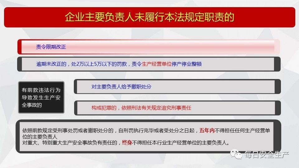 組織機(jī)構(gòu)和職責(zé) | 主要負(fù)責(zé)人未履行安全生產(chǎn)管理職責(zé)的 | 責(zé)令限期改正 | 對(duì)主要負(fù)責(zé)人處二萬元以上五萬元以下的罰款,責(zé)令生產(chǎn)經(jīng)營(yíng)單位停產(chǎn)停業(yè)整頓。 |