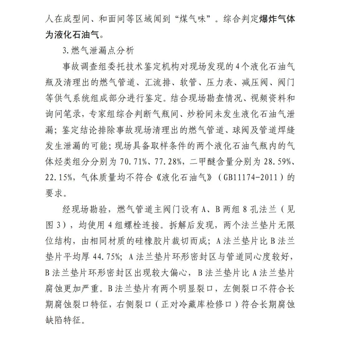 本次事故的直接原因為:京日東大公司一期生產(chǎn)車間燃氣管道主閥門A、B法蘭墊片為甲基乙烯基硅橡膠材質(zhì),受管道內(nèi)液化石油氣和二甲醚混合氣體長期腐蝕,墊片物理機械性能下降,發(fā)育出微小裂隙并逐漸增長,局部發(fā)生破損脫落;在管道內(nèi)部壓力作用下,B墊片發(fā)生撕裂并形成泄漏口,泄漏出的氣體與空氣混合,在冷藏庫內(nèi)外空間形成爆炸性混合氣體,遇電氣火花等點火源發(fā)生爆炸,并引燃現(xiàn)場可燃物,導致事故發(fā)生。