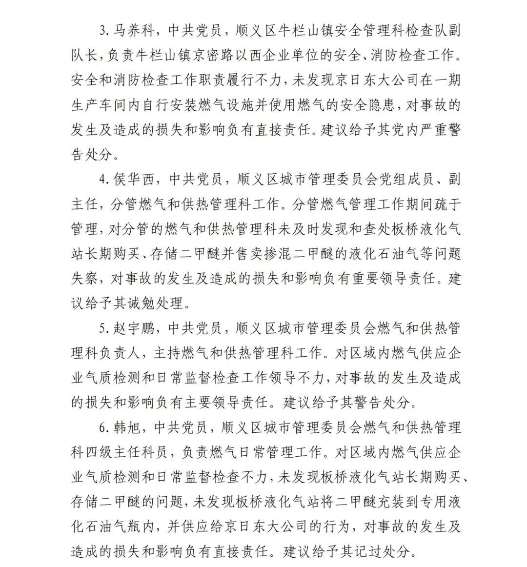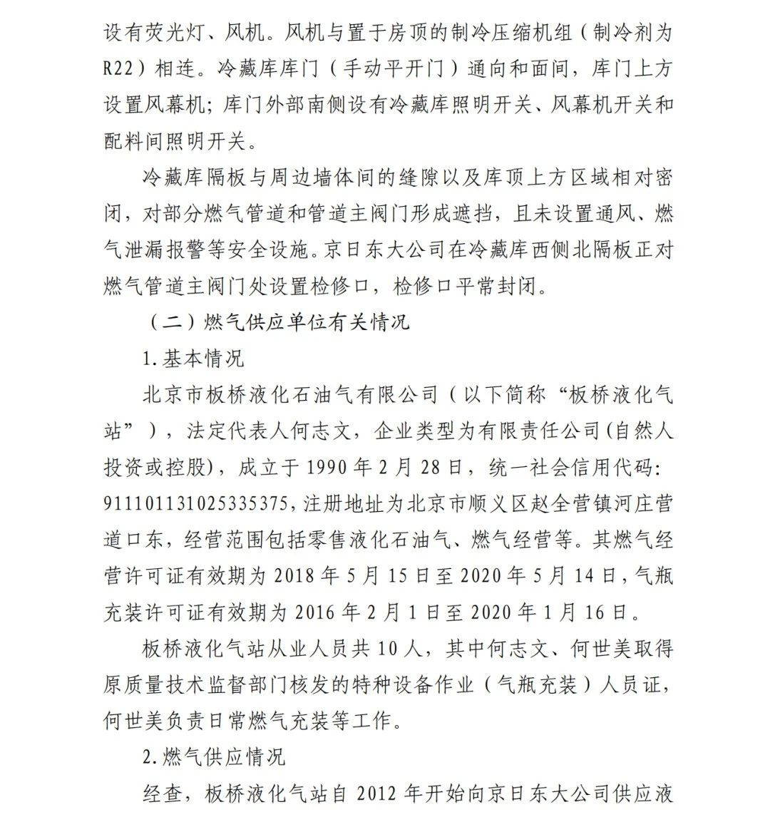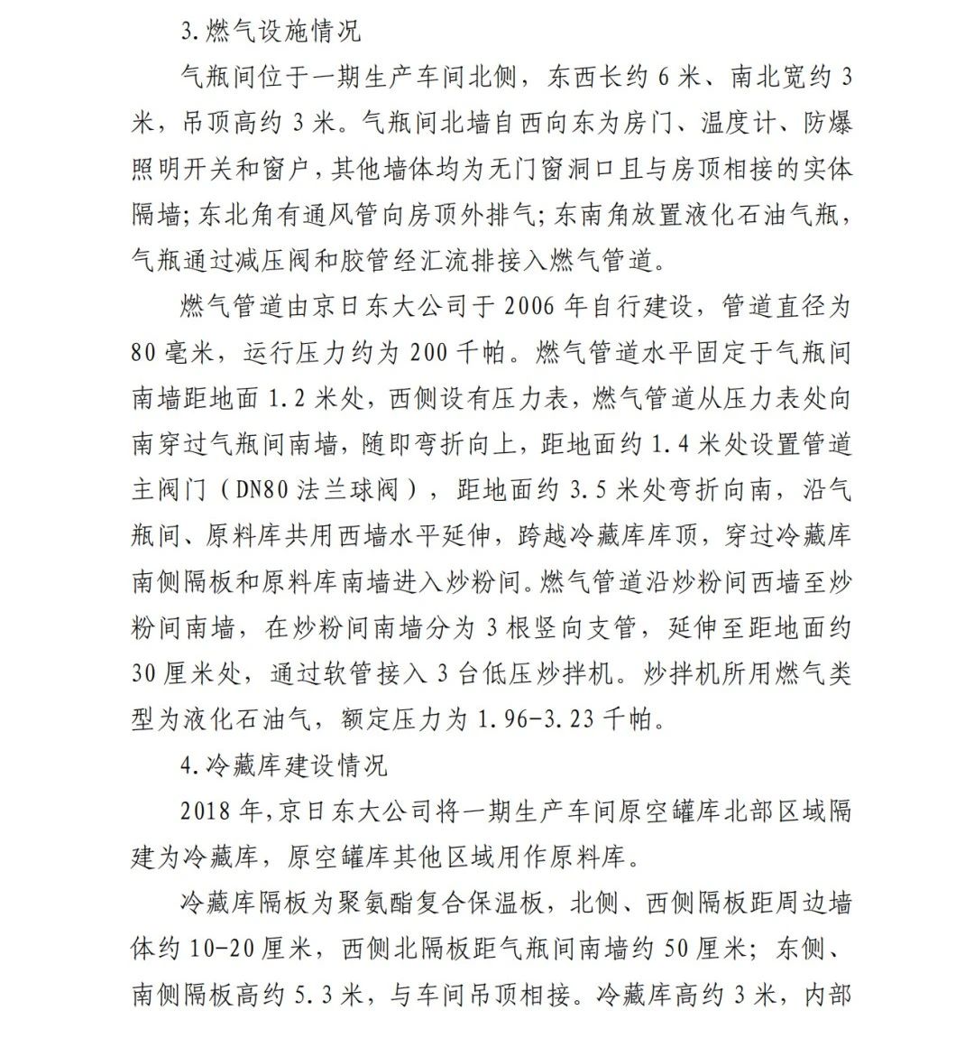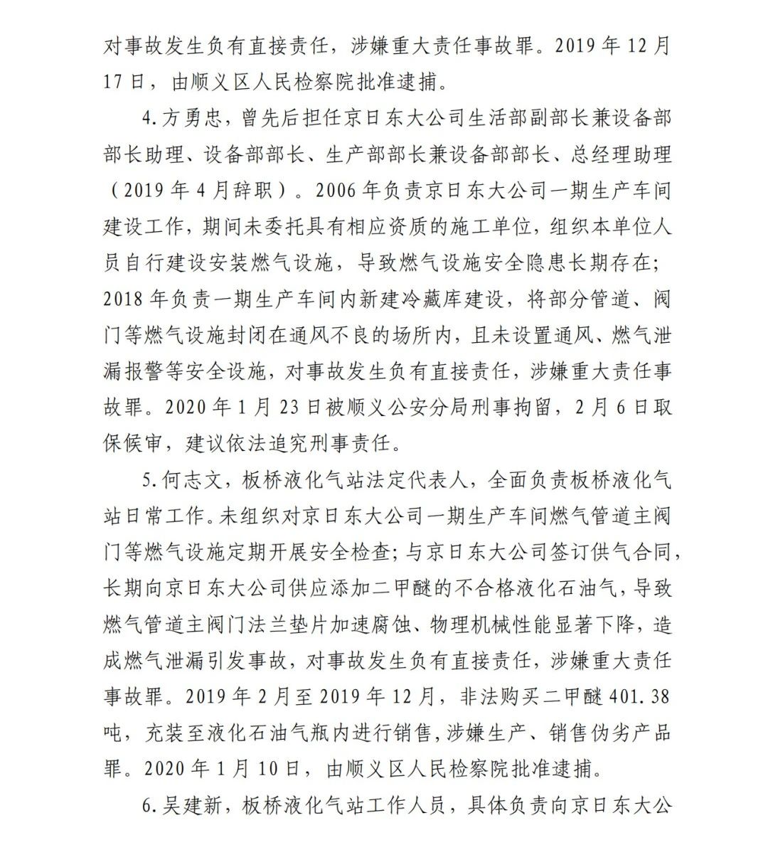 4.方勇忠,曾先后擔任京日東大公司生活部副部長兼設備部部長助理、設備部部長、生產(chǎn)部部長兼設備部部長、總經(jīng)理助理(2019年4月辭職)。2006年負責京日東大公司一期生產(chǎn)車間建設工作,期間未委托具有相應資質(zhì)的施工單位,組織本單位人員自行建設安裝燃氣設施,導致燃氣設施安全隱患長期存在;2018 年負責一期生產(chǎn)車間內(nèi)新建冷藏庫建設,將部分管道、閥門等燃氣設施封閉在通風不良的場所內(nèi),且未設置通風、燃氣泄漏報警等安全設施,對事故發(fā)生負有直接責任,涉嫌重大責任事 故罪。2020 年 1 月 23 日被順義公安分局刑事拘留,2 月 6 日取 保候?qū)?,建議依法追究刑事責任。