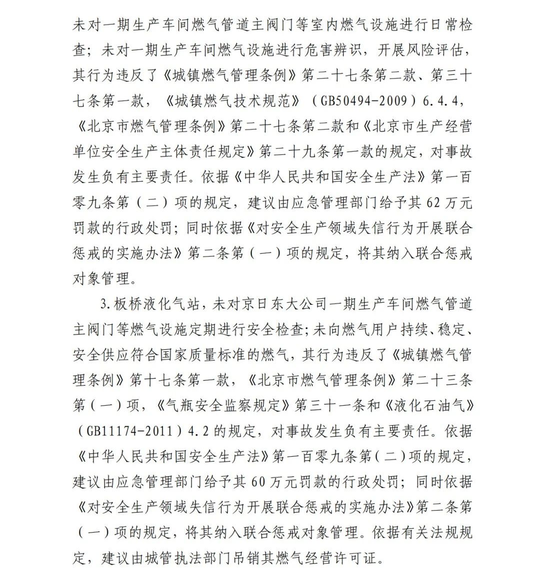 3.郭新剛,京日東大公司生產(chǎn)部部長助理、B 班班長,全面負責 B 班安全生產(chǎn)工作。事故發(fā)生當日未對一期生產(chǎn)車間燃氣設施開展檢查;發(fā)現(xiàn)燃氣泄漏后未及時報告且未采取及時有效措施,14對事故發(fā)生負有直接責任,涉嫌重大責任事故罪。2019 年 12 月 17 日,由順義區(qū)人民檢察院批準逮捕。