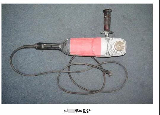 涉事設(shè)備產(chǎn)品名稱為角向磨光機,所有人:彭小共,型號:S1M-HL02B-180,電源電壓:220V-50Hz,額定空載轉(zhuǎn)速:8400r/min,功率:2600W,砂輪外徑:φ180mm,生產(chǎn)單位:蘇州聚匠人五金工具有限公司,銘牌處還有閱讀說明書提示標(biāo)識和佩戴護(hù)目鏡提示標(biāo)識,測得涉事設(shè)備的砂輪片安裝軸直徑為φ25.4mm。涉事設(shè)備的前端部位為金屬材質(zhì),其余部位均為塑料材質(zhì)。