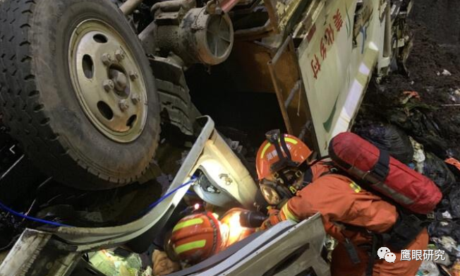 首批消防救援人員趕到現(xiàn)場了解得知,垃圾庫長 48 米、寬 20 米,總深度為 23 米,車輛從卸料平臺跌落至 12 米處的垃圾斜坡地段,呈車頂朝下、車底盤朝上倒翻狀態(tài),而且處于在垃圾坡度為 40 度左右的大斜坡上,隨時有更一步往下翻車至浸水區(qū)的危險。現(xiàn)場指揮員通過前期勘查,咨詢現(xiàn)場工作人員垃圾廢料區(qū)有無致命氣體危險等相關(guān)情況后,迅速命令 4 名救援人員佩戴空氣呼吸器,攜帶破拆工具、有毒氣體探測儀、多功能救援擔(dān)架等救援設(shè)備利用軟梯、繩索下到事故救援點(diǎn)。由于車輛嚴(yán)重變形,導(dǎo)致救援操作困難被困者一時無法移出。