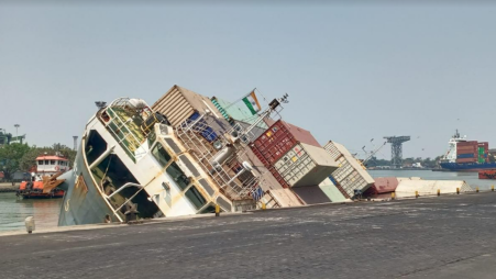 加爾各答港口官員報告說,這艘船于3月22日從印度薩加爾港抵達加爾各答,在3月24日上午剛剛完成裝載,總共裝載了165 個集裝箱,包括120個 20 英尺集裝箱和45 個 40英尺集裝箱。該船原定于今天啟程前往孟加拉國吉大港,然而突然在沒有任何征兆的情況下發(fā)生傾斜,并在15分鐘內側翻和部分沉沒,導致集裝箱掉入港口。
