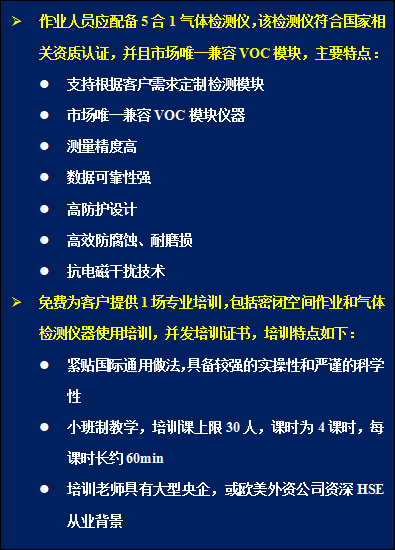 方案二 | (4)泵吸式4合1氣體檢測儀 (5)《授權(quán)氣體檢測員培訓(xùn)》+《密閉空間作業(yè)安全培訓(xùn)》 贈送2名工人的“密閉空間作業(yè)安心包”產(chǎn)品。 |